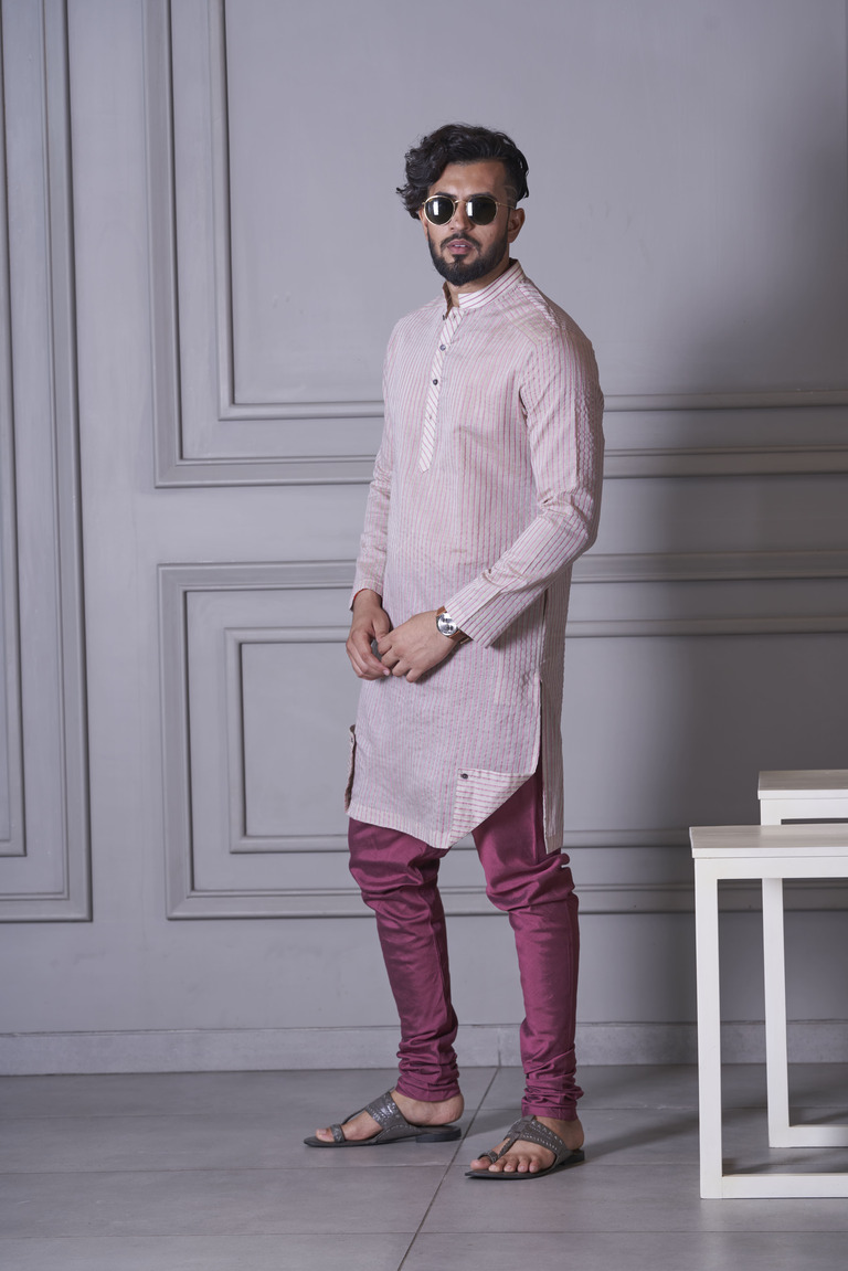 Stripe handloom cotton kurta with folded hem details and pink Nehru Jacket.